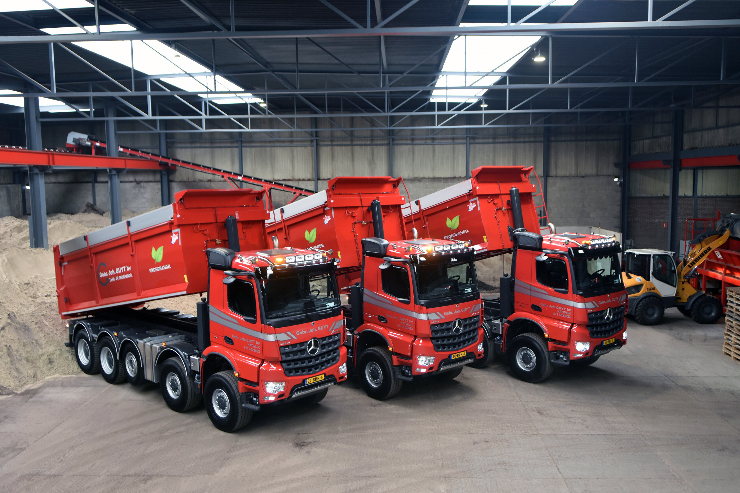 Transport en zandhandel Gebr. Joh. Guyt B.V uit Katwijk heeft drie Mercedes-Benz Arocs 10×8 kippers in gebruik genomen. Het gaat om bijzonder compact gebouwde vijf-assers met Ruijzeveld kippers.
