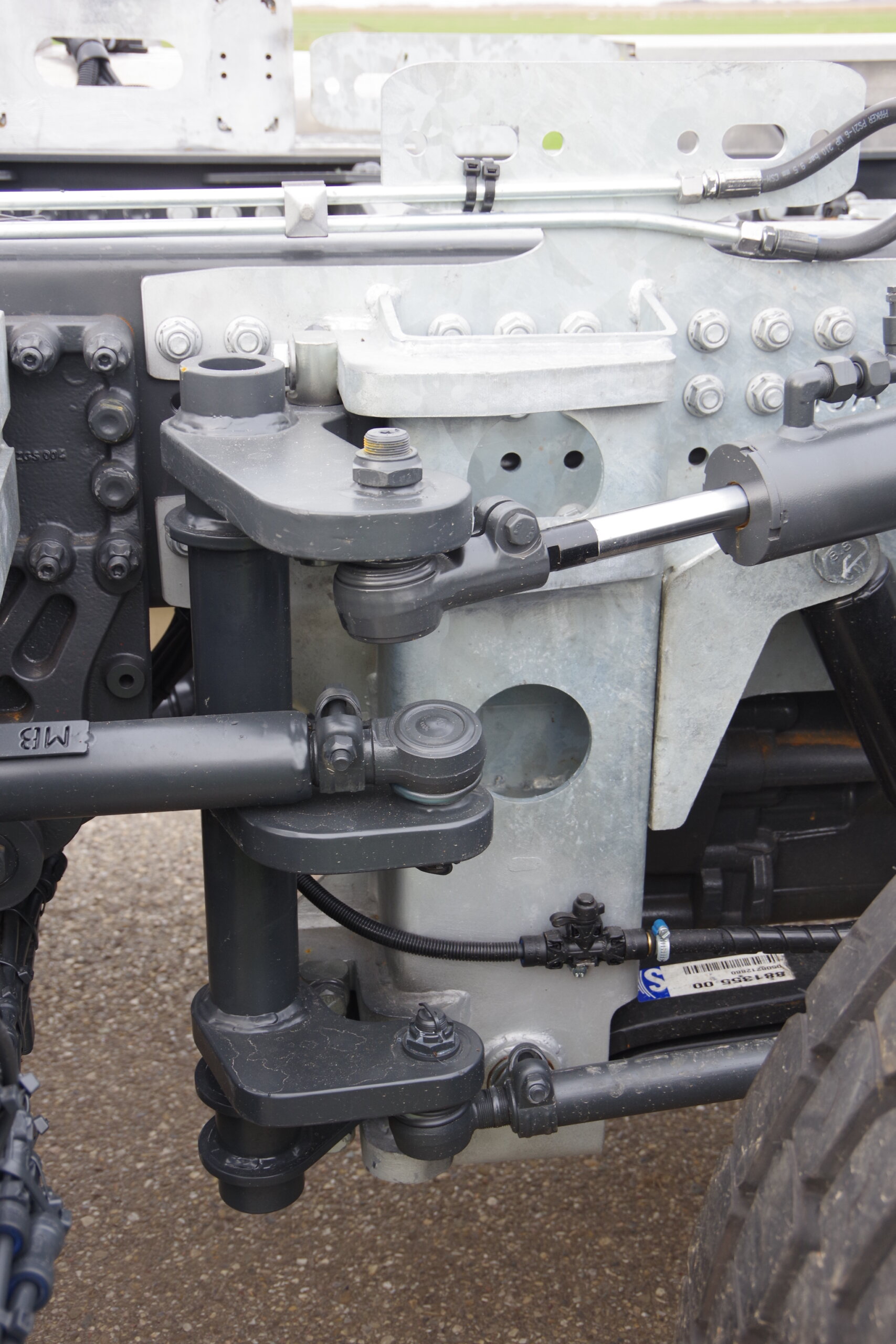 Bij de ombouw ging Veldhuizen Wagenbouw uit van een Arocs 8×8 met starre assen. Door de toevoeging van een mechanisch gestuurde 8 tons Mercedes as ontstond een 10×8 met het gewenste laadvermogen. Deze Luchtgeveerde as heeft een hefhoogte van 18 cm zodat er in zwaar terrein geen weerstand biedt. Verder werd de ophanging van de voorassen aangepast voor de hogere aslasten. In verband daarmee werden er 445/65R22,5 banden gemonteerd op de voorassen. De derde as staat op 385/65R22,5 banden, terwijl het tandemstel voorzien is van 325/95R24 banden. Daarnaast werden de accu’s, de uitlaat diverse andere aanpassingen verricht aan het chassis. De standaard brandstoftank maakte plaats voor een Y-vormige 345 liter tank tussen as twee en drie.
