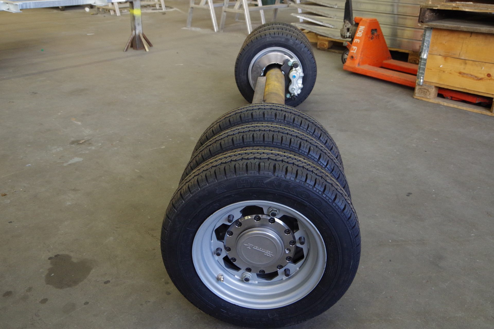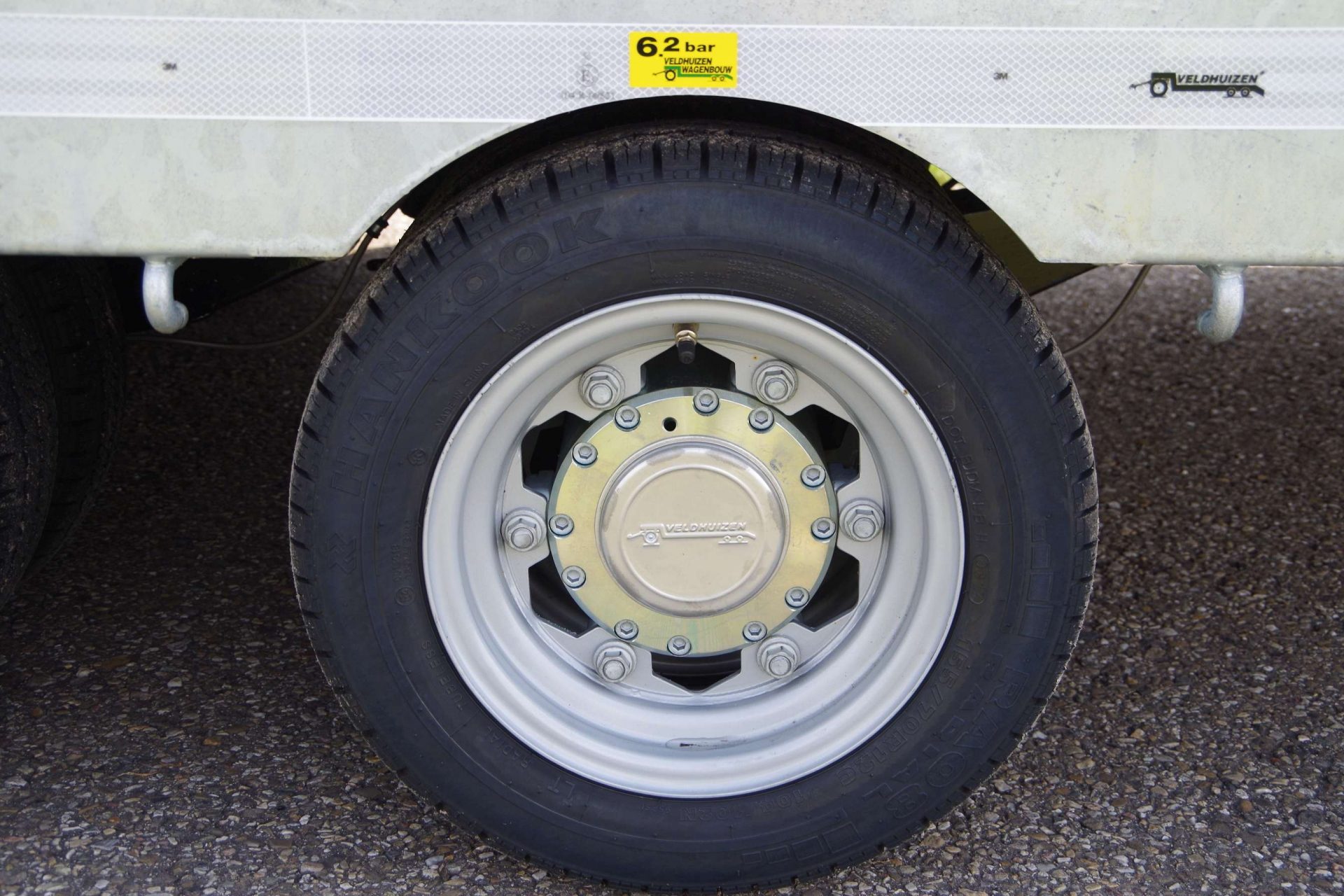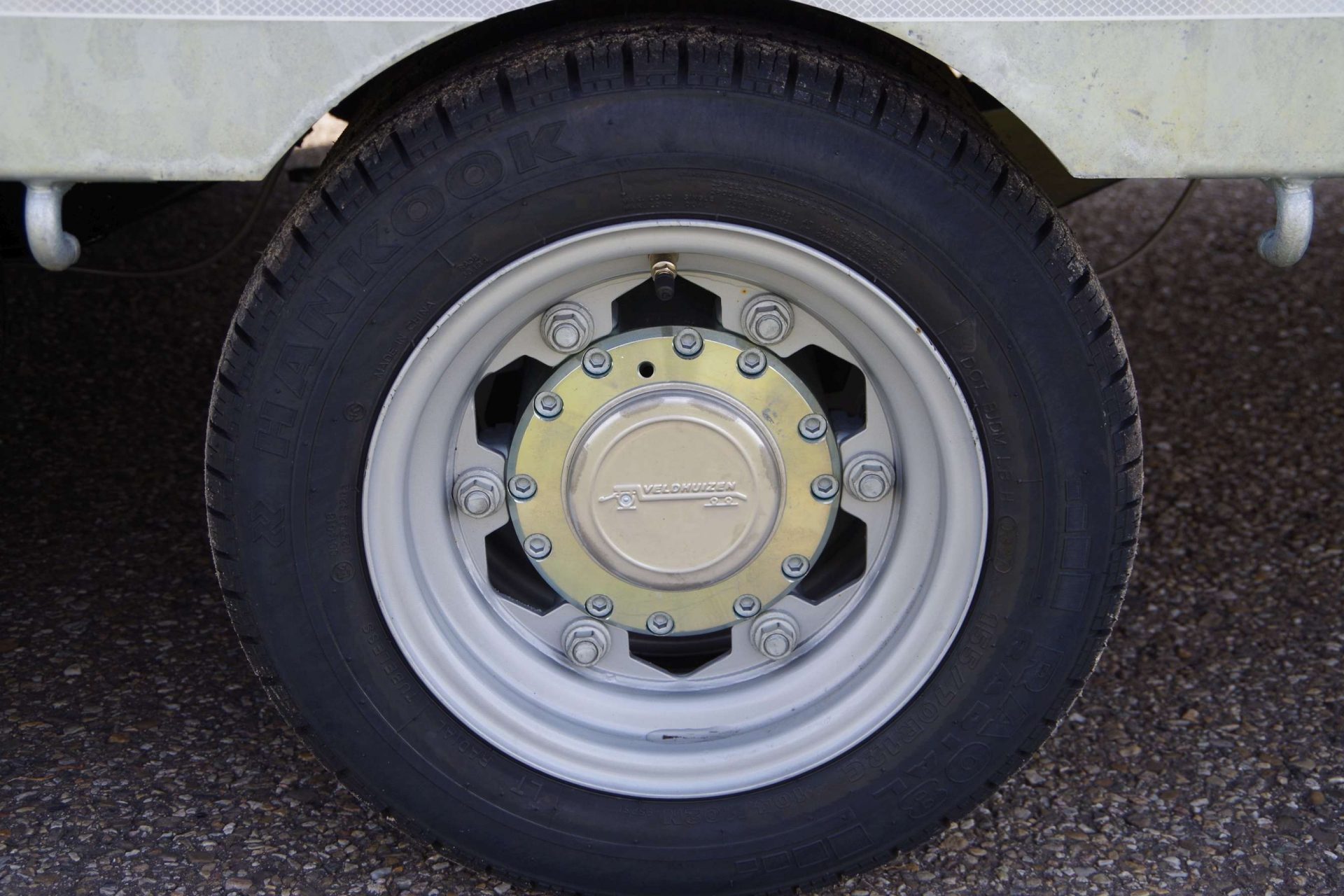 Door een nieuwe as te ontwikkelen met driedubbele montage heeft Veldhuizen nu een antwoord. De as is voorzien van 155/70R12 banden, een band die zeer succesvol wordt toegepast bij zware auto- aanhangwagens en BE opleggers. Met speciaal daarvoor ontwikkelde velgen was al dubbele montering mogelijk met deze banden waardoor het laadvermogen 3,5 ton per as wordt. Voor veel toepassingen bleek dat echter onvoldoende, reden voor Veldhuizen om door te ontwikkelen.