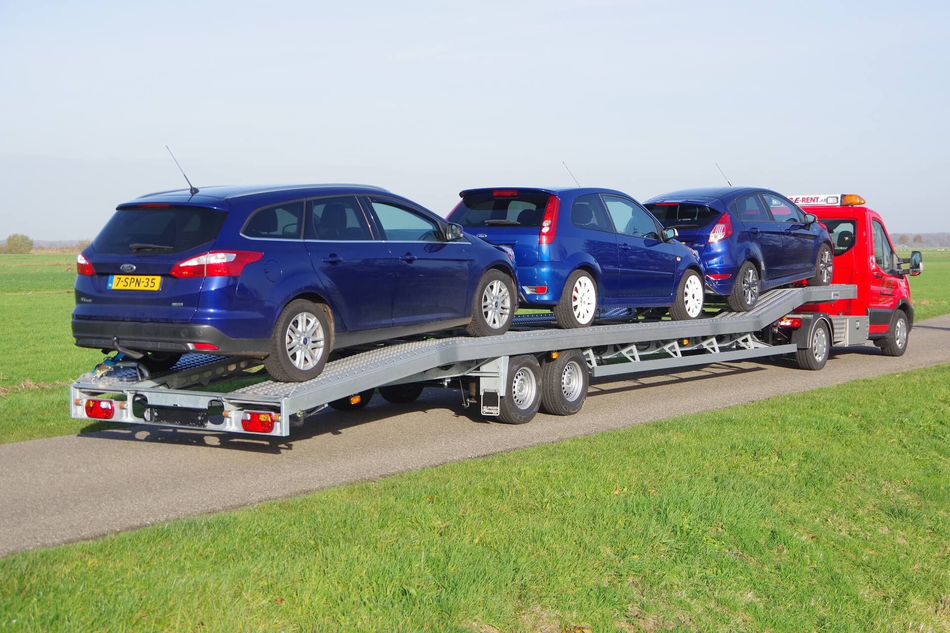 De beperkingen van het BE rijbewijs tot 7 ton totaalgewicht vormen een uitdaging voor wie voertuigen vervoert. De nieuwe regelgeving zorgt namelijk voor een beperkt laadvermogen met de bestaande opleggers. Voor Veldhuizen Wagenbouw in Groenekan was dat reden om terug te gaan naar de tekentafel. Het resultaat is een ultra lichte oplegger met een eigen gewicht van slechts 1200 kilo in de korte, en 1350 kilo in de lange uitvoering. In combinatie met een Ford Transit als trekker betekent dit dat het laadvermogen voor de korte uitvoering 3800 kg bedraagt. De lange versie mag 150 kilo minder laden volgens het kenteken. De oplegger wordt geleverd in twee lengte varianten, namelijk 10 en 12 meter waardoor drie personenauto’s geladen kunnen worden.